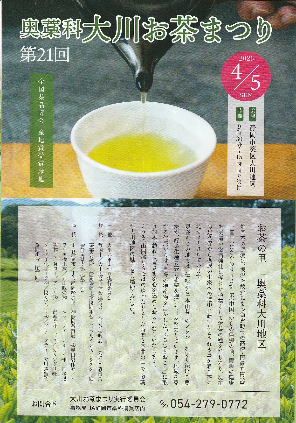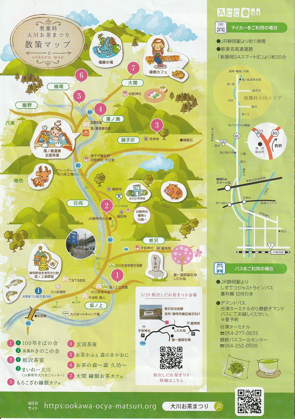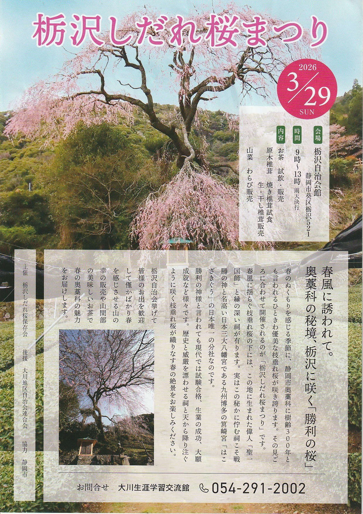 本年は、これまで開催していた「奥藁科大川お茶まつり」に加え、聖一国師と所縁が深く、しだれ桜で有名な栃沢の「栃沢しだれ桜まつり」も開催されます。